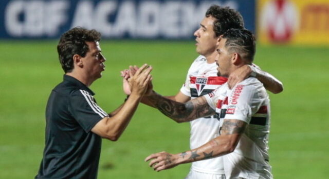 Aos 13 minutos, Igor Gomes passou para Reinaldo, que cruzou rasteiro para Pablo. O atacante dominou e ajeitou para Luciano bater no cantinho de primeira. Os atletas fizeram questão comemorar com Fernando Diniz, que está sendo questionado pela torcida e pressionado pela direção após perder a gordura de sete pontos que tinha na liderança do Brasileiro.