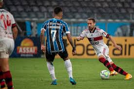 O Grêmio não suportou. Depois de troca de passes entre Bruno Henrique e Gabigol, Arrascaeta recebeu livre, na marca do pênalti, e apenas bateu para o gol vazio para marcar o terceiro, aos 20 minutos.
