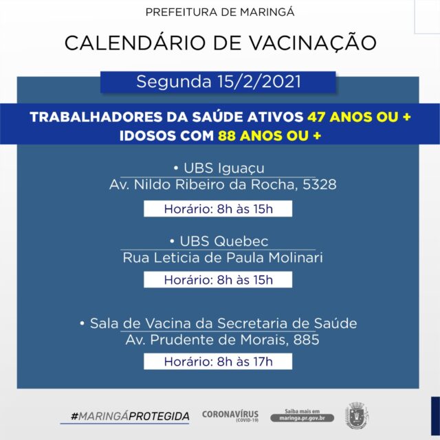 Nesta segunda-feira, 15, a campanha de vacinação contra a covid-19 será destinada aos trabalhadores da saúde ativos com mais de 47 anos que atuam em atividades hospitalares, extra-hospitalares e idosos com mais de 88 anos.