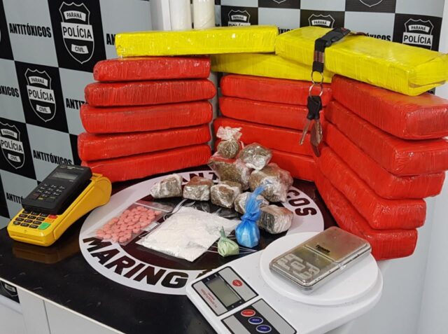 A Delegacia Antitóxico de Maringá prendeu um casal suspeito de vender droga na Rua Fernão Dias, entre o Albergue Santa Luiza de Marilac e a Guarda Municipal. Os dois suspeitos portavam uma pequena quantia de cocaína , mas foram levados até a residência de um deles no Jardim Oásis e lá os policiais encontraram grande quantidade de droga, principalmente maconha. Foram apreendidos 10 quilos da canabis, mais 39 gramas de cocaína, 44 comprimidos de ecstasy , uma maquininha de cartão de crédito e duas balanças de precisão. Os suspeitos Eduardo Felipe Lima Souza, vulgo “Zóio de Gato” e Tainara Juliana Leite, de 21 anos, foram autuados por tráfico.