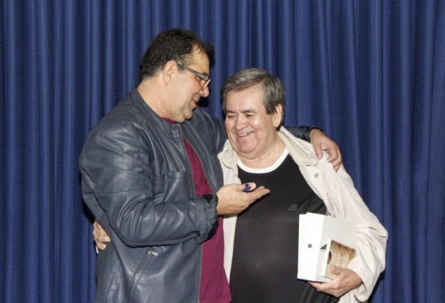 Em 2014, quando fiz o lançamento do livro “Futebol – Recortes de uma paixão”, ele esteve no Sesc. Já estava com a visão bem deficiente. Muitos amigos da imprensa presentes e o Elnio recebendo o carinho de todos. Tenho algumas fotos abraçando o Elnio logo depois de autografar o meu livro para ele. Acabei de revê-las e me emocionei. Me veio aqueles tempos, trinta anos atrás, muito trabalho e pouca grana. A grana continua curta, mas não tem mais aquela loucura. Em maio de 2018, fui com o Dionísio ao escritório do Elnio, que queria doar ao Museu Esportivo de Maringá um quadro do MAC, campeão da Segundona paranaense de 1989. A seguir, transcrevo parte do texto que fiz e publiquei no site do Museu Esportivo de Maringá em 2018: