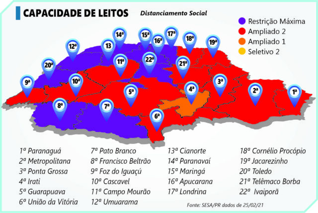 A macrorregião Leste, de Ponta Grossa e Curitiba, encerrou janeiro com 82% dos 671 leitos de UTIs ocupados. No último dia de fevereiro, 97% dos 688 leitos estavam com pacientes. No dia 31 de agosto do ano passado, a taxa de ocupação dos 601 leitos era de 81%. A iminência de saturação completa dos leitos de UTI no Paraná foi derradeira para o fechamento do comércio, a suspensão das aulas e a restrição à circulação de pessoas.