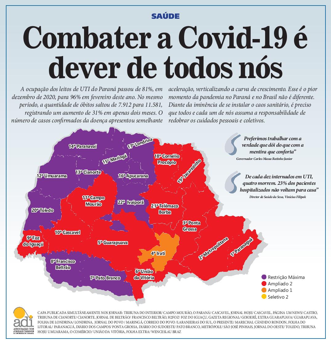Dos 399 municípios do Paraná, foram registrados óbitos em 383. A doença ceifou a vida de 229 profissionais de saúde, sendo 45 médicos e 63 enfermeiros. Por regional de Saúde, a Metropolitana de Curitiba tem a maior quantidade de baixas. São 4.627, cerca de um terço do total do estado. A 17ª Regional de Londrina, saltou de 657 óbitos em 2020 para 1.006 em fevereiro deste ano.
