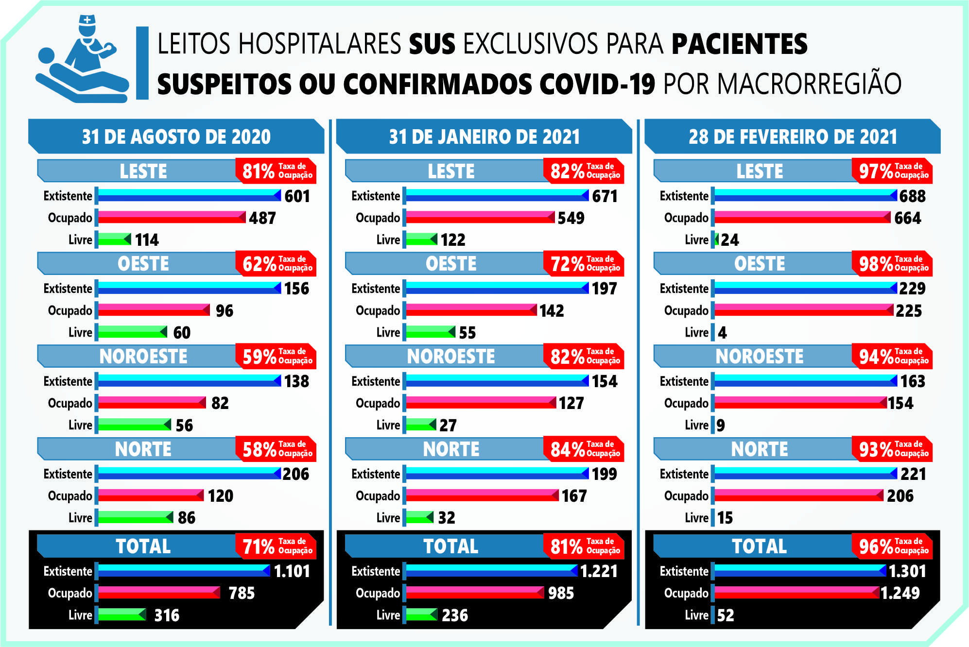 O Paraná fechou fevereiro com o índice de ocupação dos leitos de Unidade de Terapia Intensiva (UTI) exclusivos para pacientes covid-19 adultos pelo Sistema Único de Saúde (SUS) mais alto de toda a pandemia. A média estadual chegou a 96% no último final de semana. Em agosto de 2020, até então o auge da crise sanitária no estado, a ocupação média no dia 31 era de 71%. Na época, o número de UTIs era menor, 1.101. Agora são 1.301.