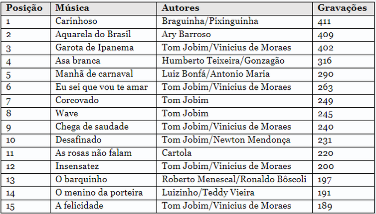 Entre as 15 primeiras músicas do ranking, oito são de autoria do compositor Tom Jobim: além de Garota de Ipanema, aparecem Eu sei que vou te amar, Corcovado, Wave, Chega de Saudade Desafinado, Insensatez e A felicidade.