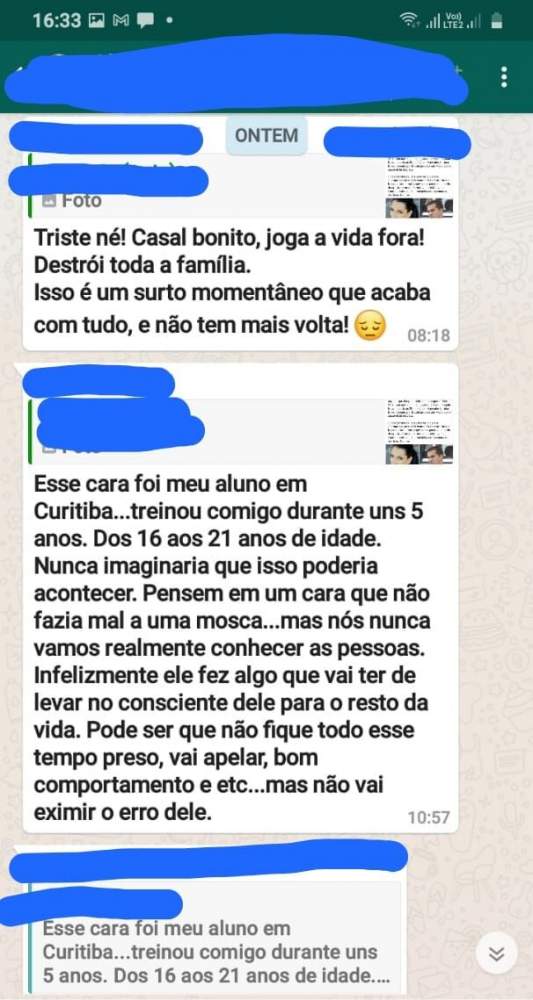 A transcrição literal da troca de mensagens mostra um dos internautas comentando a condenação do professor de Guarapuava , Luís Felipe Manvailer, que matou a esposa Tatiane Spitzner. Luis Felipe era praticante de jiu jitsu. Um dos internautas disse que foi professor dele em Curitiba: “Esse cara foi meu aluno em Curitiba… Treinou comigo durante uns 5 anos. Dos 16 aos 21 anos de idade. Nunca imaginaria que isso pudesse acontecer. Pensem num cara que não fazia mal para uma mosca… Mas nós nunca vamos realmente conhecer as pessoas. Infelizmente ele fez algo que vai ter de levar no consciente dele pro resto da vida”.