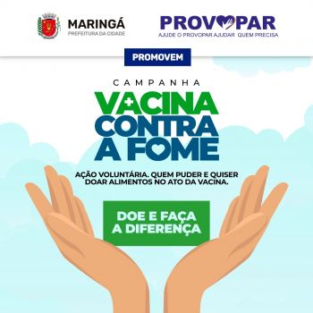 O Provopar convida as pessoas que estão sendo vacinadas contra a COVID-19 a realizar, voluntariamente, doações de alimentos durante a Campanha Vacina contra a Fome. A iniciativa prossegue em todos os pontos de vacinação. A Prefeitura de Maringá e Provopar arrecadaram mais de 4 toneladas de alimentos. O objetivo é beneficiar famílias carentes e com deficit nutricional durante o enfrentamento da pandemia do coronavírus.