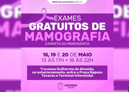Mulheres que pertencem ao grupo de risco no desenvolvimento do câncer de mama, a partir dos 35 anos, podem realizar o exame preventivo de mamografia, em Maringá, de forma gratuita. Os atendimentos vão acontecer até quinta-feira nos períodos da tarde, das 13 às 17 horas, e a noite, das 18 às 22 horas, na carreta do programa ‘Cuide-se +’ que está estacionada na travessa Guilherme de Almeida, entre a praça Rocha Pombo e o Terminal Intermodal. A iniciativa é da Secretaria Municipal de Políticas Públicas para Mulheres (Semulher) e Secretaria Municipal de Saúde.
