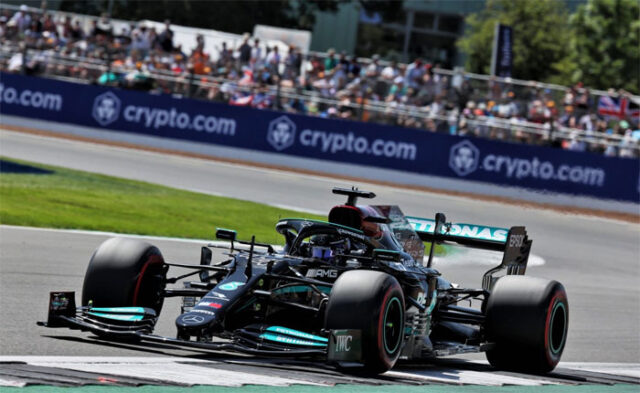 Hamilton recebeu uma punição de 10 segundos por colidir com Verstappen na Copse na volta inaugural, tirando o líder do campeonato da prova e provocando uma bandeira vermelha.