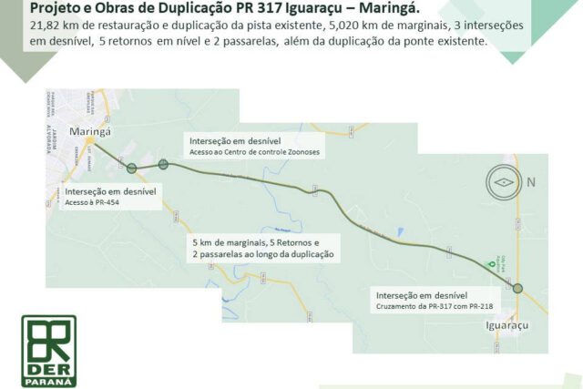 O Departamento de Estradas de Rodagem do Paraná (DER/PR) homologou o resultado da licitação da elaboração de projeto e execução da obra de duplicação da PR-317, entre Maringá e Iguaraçu, na região Noroeste, um investimento de R$ 183.456.873,42.