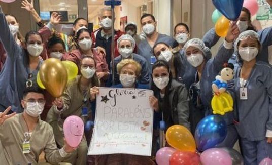 Glória Menezes foi homenageada pela equipe médica do Hospital Albert Einstein nesta segunda-feira (16) depois de receber alta. Na imagem — publicada por Claudia Raia nos stories do Instagram — a atriz de 86 anos aparece sentada na cadeira de rodas e cercada dos funcionários, com balões e bexigas, e também do filho, Tarcísio Filho, que aparece ao fundo da foto.