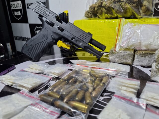 O setor de antitóxico da 9ª. SDP monitorava dois jovens vistos em atitude suspeita no estacionamento de um supermercado da região central de Maringá. Os policiais fizeram a abordagem e prenderam Gustavo Rodrigo , de 23 anos, que veio de Curitiba para morar em Maringá há um ano. Com ele estava um menor de 17 anos, apreendido e entregue à Justiça. Na casa de Gustavo os policiais encontraram mais droga, arma e munição. Segundo a polícia , Rodrigo vendia droga por aplicativo e usava o menor de idade para entregar.
