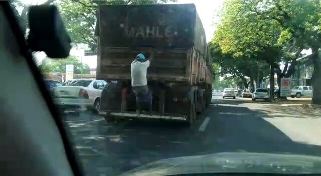 O caminhoneiro não viu, mas de acordo com o Código Nacional de Trânsito correu risco de ser multado e até de ter o veículo retido enquanto o “caroneiro” se expôs a uma situação real de perigo. O morador que fez as imagens disse que tentou avisar o motorista do caminhão, mas o mesmo não entendeu os sinais que ele fez quando parou do lado em um sinaleiro. O flagrante foi registrado ontem pela manhã na avenida mais movimentada e perigosa da cidade – a Colombo. A Polícia Rodoviária Federal ponderou que o morador poderia ter insistido mais, porque estava diante de um risco real de acidente grave. Quando não é possível avisar o motorista, a pessoa deve anotar a placa e avisar as autoridades de trânsito.