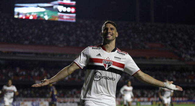Aos 6 minutos, valeu. O São Paulo trocou passes, até a bola chegar em Reinaldo, na lateral esquerda, que cruzou para Calleri empurrar para o gol e abrir o placar no Morumbi.