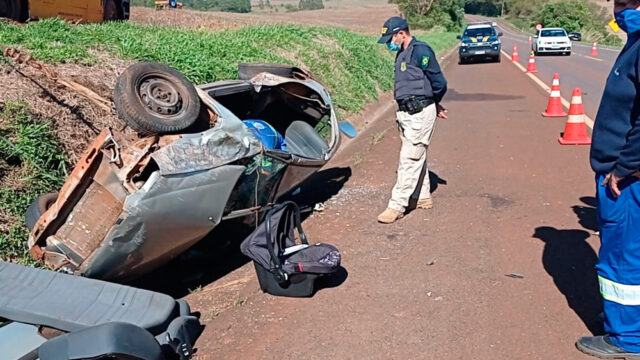 Uma família de Maringá sobreviveu milagrosamente a um grave acidente ocorrido no KM 370 da BR-369, entre Campo Mourão e Mamborê. O casal seguia em um Gol no sentido Cascavel na manhã de ontem quando o veículo ficou desgovernado e capotou diversas vezes, parando com a rodas para cima. A causa do acidente teria sido o estouro de um pneu, o que fez com que o motorista perdesse o controle da direção. O condutor, que não teve seu nome divulgado, nada sofreu mas a mulher dele, que estava no banco do carona teve ferimentos graves. O filho do casal, de apenas um ano escapou ileso, graças à cadeirinha, segundo avaliação dos socorristas do Samu e da Viapar A mulher foi trazida pelo aeromédico dos Bombeiros de Maringá para o Hospital Metropolitano de Sarandi.