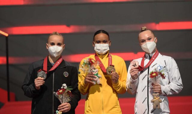 A ginasta, de 22 anos, sobrou no salto sobre a mesa, assim como já fizera nos Jogos de Tóquio, que resultou no ouro. Rebeca foi às alturas nos dois saltos da final – um Cheng (15,133) e um Yurchenko (14,800) – totalizando 14,966, deixando para trás a italiana Asia D’Amato (14,083) e a russa Angelina Melnikova (13,966).