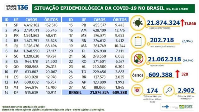 O balanço apontou também 202.718 pacientes em acompanhamento e 21.061.218 recuperados da doença.