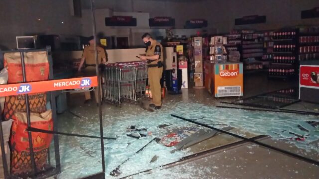 Os ladrões arrombaram a porta de entrada de um mercado em Campo Mourão com o carro em que estavam. O barulho da batida ecoou pela madrugada na Avenida Armelindo Trombini e mesmo chamando a atenção de moradores, que ligaram para a polícia, os ladrões tiveram tempo de pegar vários potes de sorvete, biscoitos e pacotes de arroz e feijão.