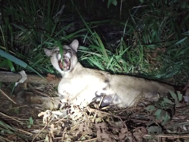 O fato aconteceu em uma mata no município de São Carlos do Ivaí na noite de sexta-feira para sábado . Policiais militares ambientais resgataram a onça parda que ficou presa em uma armadilha montada para capturar capivara às margens do Rio Ivaí. Para dominar o animal, a polícia ambiental teve que usar enforcador e o veterinário presente na operação resgate, aplicou um sedativo que fez a onça adormecer. Após o resgate, o animal foi solto na mata.