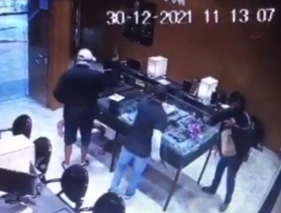 Conforme as imagens, quatro homens em duas motos, invadiram a joalheria, renderam funcionários e clientes e roubaram, joias e vários relógios de luxo.