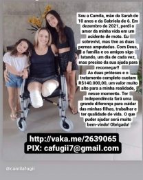 “Eu acordei e tive uma surpresa. Conseguimos atingir o valor que eu preciso para as minhas próteses. Muito obrigada a todos os que me ajudaram, vai ser muito importante para mim. Eu agradeço a movimentação de todos porque em um dia a gente conseguiu atingir um valor tão alto. Preciso ter força por mim e pelas minhas duas filhas que ficaram sem o pai, Sarah, de 10 anos, e Gabriela, seis anos. Com Deus, a família e os amigos sigo lutando um dia de cada vez. As próteses vão me dar independência pra cuidar das minhas filhas, trabalhar, ter qualidade de vida”, disse Camila.