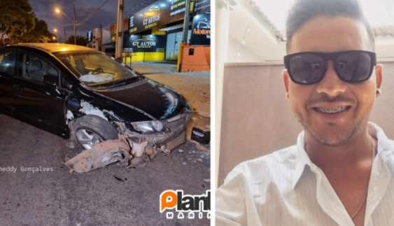 Câmera de segurança registrou o momento em que Wesley Menegueti, 31 anos, colidi com seu veículo Honda Civic em uma caçamba. O acidente aconteceu na madrugada de sábado (5). Wesley morreu com o impacto.