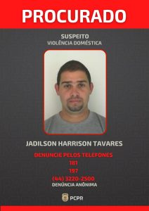 A Polícia está desde o dia 8 de fevereiro a procura de um homem de 43 anos, suspeito de violência doméstica contra a ex-companheira . Ele é suspeito de ameaçar e perseguir a vítima. Numa determinada ocasião ele teria invadido o local de trabalho dela e quebrado vidros e vários objetos com um porrete. Depois a agrediu fisicamente , deixando marcas profundas no rosto da mulher. Para tentar localizar o suspeito, a Polícia Civil do Paraná divulgou a foto de Jadilson Harrison Tavares. Qualquer informação pode ser passada via telefones 197 e 181.