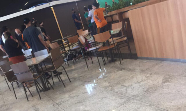 Várias pessoas almoçavam na praça de alimentação do Shopping Catuaí de Londrina quando um homem de camisa branca e máscara se aproximou de um casal e começou a atirar ontem por volta das 11h30. O alvo era Marcos Vinícius Roque, conhecido como “Tchopinha”, de 33 anos , que morreu no local. A mulher que estava com ele tentou protege-lo mas acabou sendo atingida também e foi internada com ferimentos graves. O casal é de Rolândia e segundo a polícia, “Tchopinha” tinha ficha criminal. Uma câmera de segurança registrou toda a ação. Mostra o momento em que o atirador começa a disparar. As primeiras investigações da Polícia Civil apontam para a possibilidade de execução, devido a briga entre rivais do tráfico em Rolândia. O atirador continua foragido.