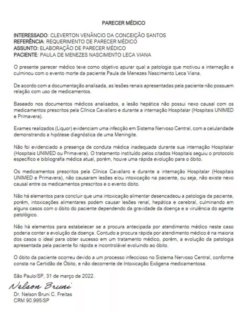 O médico também declara que, para ele, “não foi evidenciada a presença de conduta médica inadequada” e “não há elementos para estabelecer se a procura médica antecipada por atendimento médico, neste caso, poderia conter a evolução da doença”.