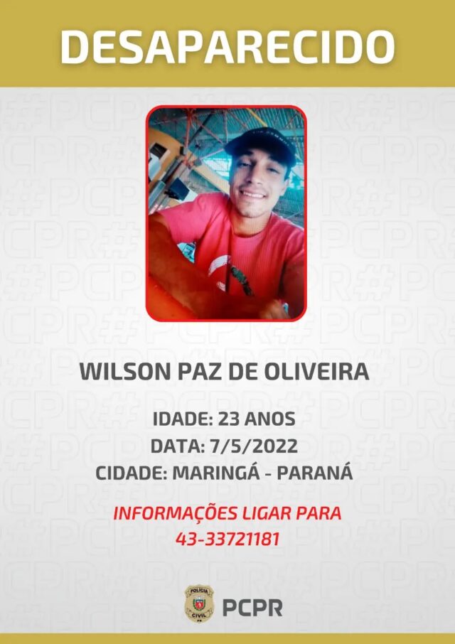 A família de Wilson Paz de Oliveira, de 23 anos, procurou a  Polícia Civil , que passou a divulgar um cartaz com a foto do jovem. O sumiço dele está deixando os familiares em polvorosa e a Polícia do Paraná intrigada. O jovem saiu de Maringá com destino ao município de Água Boa (MT), no dia 6 de maio deste ano. Desde o dia 7 de maio ele não fez mais contato com familiares.  Wilson embarcou na Rodoviária de Maringá em um ônibus que fez a primeira parada em Ilha Solteira, São Paulo. Na parada o ele fez seu último contato com a família, informando que a previsão de chegada ao destino final da viagem seria no dia 9. Wilson iria trabalhar em uma fazenda, onde já havia estado.