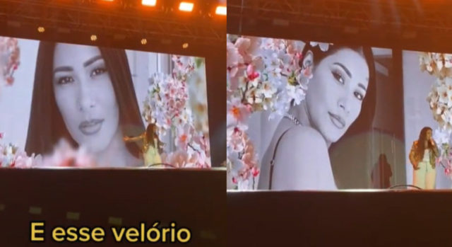 As fotos de Simaria em preto e branco e com flores apareceram no telão do palco, enquanto Simone cantava a música Amiga, escrita pela irmã.