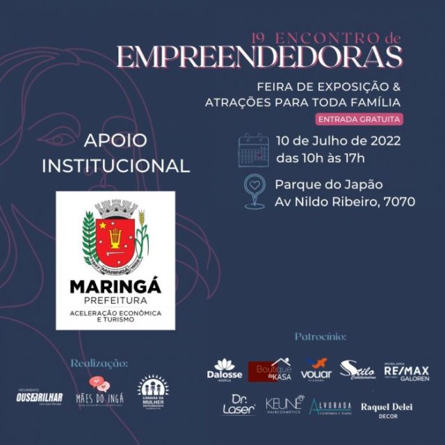 A programação do encontro será aberta com a palestra “A força do empreendedorismo feminino”, com Isolene Niedermeyer; às 10h30 tem a entrega do Prêmio Sebrae para Empreendedoras; ainda tem dinâmica de Yoga, apresentação de dança, almoço e música ao vivo com a cantora Ana Clara. Na parte da tarde, a partir das 14 horas, mais palestras: “A ousadia em ser empreendedora e brilhar”, com Dani Mendes; e “A união do Empreendedorismo materno”, com Mari Tait, do Grupo Mães do Ingá. Às 16h30 tem sorteio de prêmios das expositoras e o encontro encerra às 17 horas. Cronograma completo disponível no site da Prefeitura de Maringá.