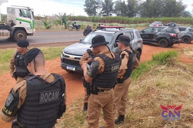 De acordo com a Polícia Militar os grupo foi localizado nas margens da PR-218 e com a aproximação da tropa de choque dois deles fugiram e um , que ficou no carro tentou reagir e foi morto na troca de tiros. O suspeito morto foi identificado como Mateus Ramos, de 20 anos. Os fugitivos se emprenharam em uma mata e até ondem à tarde não haviam sido localizados. A Polícia Militar não encontrou o malote e a vítima não soube informar a quantia em dinheiro que foi roubada. Durante a ação da polícia foi detido um casal , que tinha mandado de prisão em aberto, expedido pela justiça de Avaré (SP).