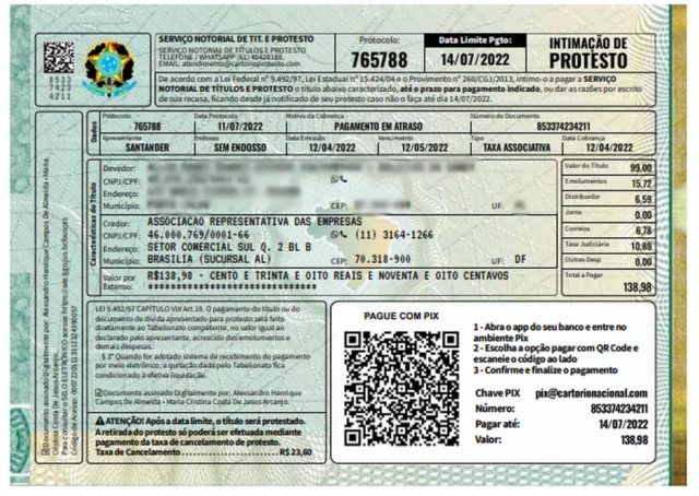 O comunicado é da Associação dos Notários e Registradores do Estado do Paraná (Anoreg) e tem o objetivo de alertar pessoas que vem recebendo esse tipo de intimação. Os golpistasenviam uma intimação de protesto para as vítimas, com a cobrança de dívidas a serem pagas imediatamente. O falso documento simula selos do governo federal, que trazem informações falsas de leis e dados pessoais da vítima. Além disso, segundo a Anoreg/PR, os estelionatários emitem boletos que devem ser pagos via Pix, geralmente em nome de uma empresa de fachada.