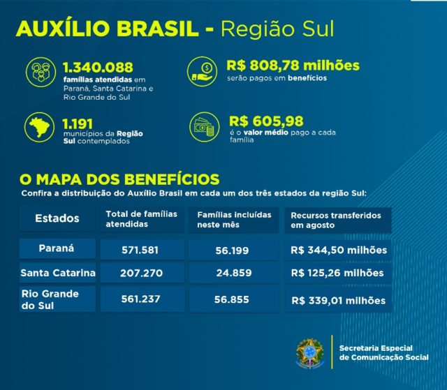 A Região Sul é a segunda do Brasil com menor número de famílias assistidas pelo Auxílio Brasil em agosto, com 1,340 milhão de beneficiados. Apenas o Centro-Oeste tem um número menor: 1,053 milhão. Juntos, Paraná, Santa Catarina e Rio Grande do Sul receberão repasses de mais de R$ 808,78 milhões para o pagamento dos benefícios.