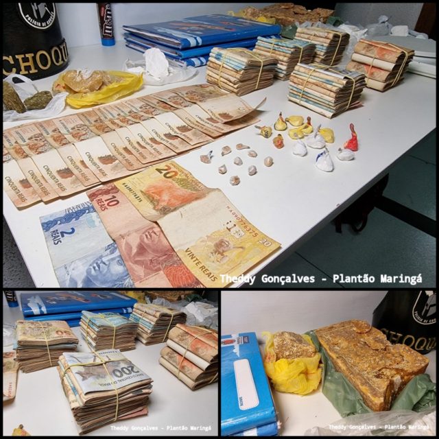 Uma equipe do Pelotão de Choque da Polícia Militar prendeu quatro suspeitos de envolvimento com o tráfico e com eles apreendeu muita droga e R$ 45 mil em dinheiro vivo, a maioria notas de pequeno valor, característica da venda de entorpecentes no farejo, o chamado “comércio formiguinha”. As prisões ocorreram durante patrulhamento de rotina no Loteamento Madrid, em Maringá. Os policiais suspeitaram de dois homens e os seguiram até Sarandi onde os abordaram. Depois foram até a casa de um deles e lá apreenderam mais droga e o dinheiro em espécie, além de dar voz de prisão a um terceiro suspeito, que parou em frente à residência em uma moto. Após efetuar a terceira prisão, os policiais foram informados de que havia um quarto elemento que traficava em outros bairros de Sarandi. Ele foi preso com grande quantidade de drogas no Jardim Ana Eliza.