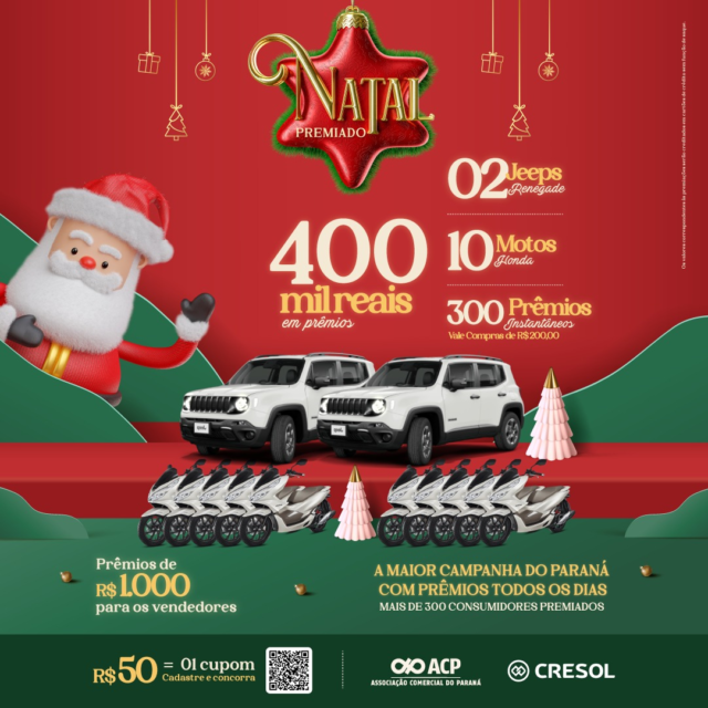 A ação tem o objetivo de fortalecer a economia e incentivar o comércio local. Para isso, serão distribuídos até o final da campanha mais de R$ 400 mil em prêmios, Instantâneos diários no valor de R$ 200,00, 02 Jeeps Renegade, 10 Motos Honda que serão sorteados no dia 20 de janeiro de 2023. Além disso, os vendedores das compras sorteadas também serão premiados com cartões presente no valor de R$ 1.000,00. Neste ano, o consumidor vai se cadastrar na campanha por um aplicativo, cujos dados serão impressos pela ACP e depositados em uma urna na entidade.