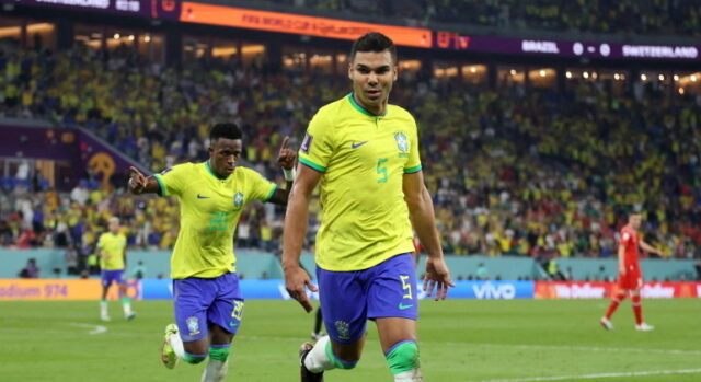 Um gol a ‘Real Madrid.’ Vinicius Junior tocou para Rodrygo, que conseguiu o passe para Casemiro. O agora jogador do Manchester United, que bateu fortíssimo. No alto. Sem defesa para Sommer. 1 a 0, Brasil.