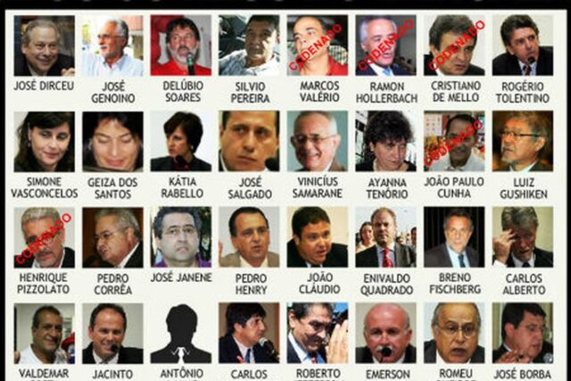Mensalão que ocorreu no primeiro mandato de Lula, envolvendo crimes de corrupção contra integrantes de diversos partidos (PP, PL, PMDB, PTB e outros) teve 38 réus pelos crimes, envolvendo o pagamento mensal a deputados em troca de apoio em votações no Congresso.