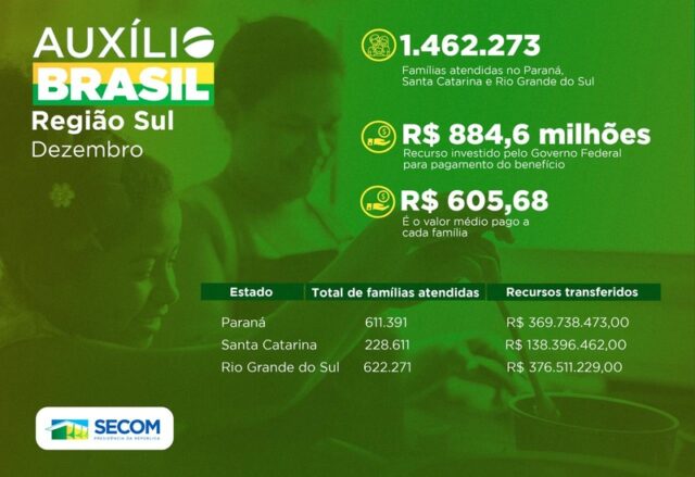 Em toda a Região Sul, o Auxílio Brasil assistiu 1.462.273 famílias em dezembro. É o maior patamar desde o início do programa. Para o pagamento das parcelas do mês, foram repassados ao estado mais de R$ 884,6 mil em recursos federais. Com isso, cada família do Sul do país contemplada pelo programa recebe em média R$ 605,68. Já o Auxílio Gás contempla neste mês 394.028 de lares na região, com um de R$ 44,1 milhões.