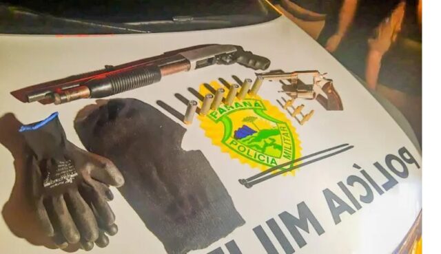 Por volta das 23hs de segunda-feira uma equipe que trabalha em Floresta se deparou com o Vectra suspeito, trafegando no sentido Maringá. Foi dada voz de abordagem, os criminosos tentaram fugir mas os policiais acertaram um dos pneus traseiros do carro. Os dois desceram, dispararam contra a equipe e foram presos após entrarem em um matagal à margem da rodovia. Dentro do carro que eles haviam abandonado, a polícia apreendeu armas de fogo, toca balaclava, luva e aparatos utilizados para amarrar as vítimas. Os dois suspeitos foram encaminhados para a 9ª. SDP de Maringá.