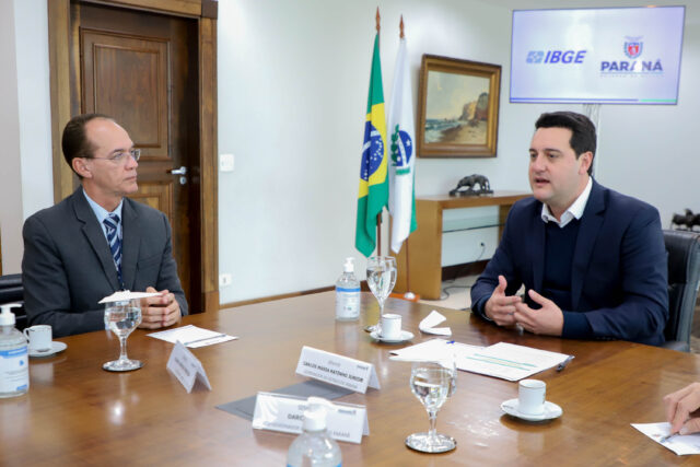 O governador Carlos Massa Ratinho Junior recebeu nesta quarta-feira (21) o presidente do Instituto Brasileiro de Geografia e Estatística (IBGE), Cimar Azeredo, que está no Paraná para apresentar o processo de realização do Censo 2022. Os primeiros resultados serão divulgados na próxima quarta-feira (28). Ratinho Junior destacou a importância das informações do Censo para subsidiar o planejamento das políticas públicas do Estado em diferentes áreas.