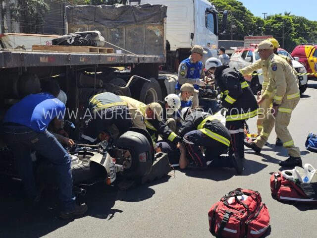O acidente foi registrado segunda-feira no perímetro urbano de Maringá. Um idoso de 66 anos caiu com a moto que pilotava embaixo dos rodados de uma carreta numa rotatória da BR-376 próximo à fábrica da Coca-Cola. Quem passou pelo local logo após o acidente achou que o motociclista tinha morrido. Mas felizmente foi retirado com vida pelos socorristas do Samu, que transportaram a vítima para o Hospital Metropolitano de Sarandi. Ele foi internado em estado grave com fratura em uma das pernas e no tórax.