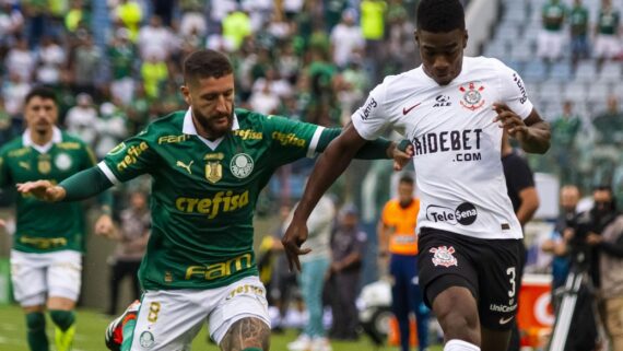 Nome do primeiro tempo, Endrick abriu o placar. Destaque no segundo, Flaco López voltou a balançar as redes. Só que ninguém esperava um final de clássico maluco! Com dois a menos, após a expulsão de Cássio e a lesão de Yuri Alberto, autor do primeiro gol, o Corinthians arrancou um improvável empate em 2 a 2 com o Palmeiras, em uma Arena Barueri alviverde. Ainda invicto, o Verdão chegou aos 18 pontos, na liderança do grupo B, mas ainda abaixo do Santos, que mantém a melhor campanha do campeonato mesmo com a derrota de mais cedo. O Timão, com apenas dez, segue longe da classificação. Endrick comanda primeiro tempo O Palmeiras começou o clássico ocupando melhor os espaços e, também, mais agressivos nas divididas. A confiança também estava do lado alviverde. Logo no começo, Flaco López tentou marcar do meio-campo, sem acertar o alvo. Flaco teve chance muito mais perto minutos depois. Entrick descolou uma grande bola para o argentino, que girou e saiu na cara do gol. Flaco tentou tirar de Cássio, mas tirou tanto que a bola saiu, também, do gol. O time de Abel Ferreira concentrava o jogo no corredor central, onde conseguia superioridade numérica. Quando o Corinthians ficava com a bola, o portador tinha sempre a pressão de três adversários fechando linhas de passe. Sufocando a saída de bola adversária, o Verdão conseguia boas chances através de roubadas de bola no campo de ataque. Após recuperação de Endrick, Flaco teve mais uma chance na área. O atacante cortou para a perna canhota e bateu forte, assustando Cássio. O gol palmeirense demorou, mas saiu aos 43 minutos. Endrick, destaque até então servindo os companheiros, recebeu bola na entrada da área, levou para a meia-lua e bateu forte de canhota. Cássio desviou, mas não evitou a entrada da bola. O “endiabrado” Endrick quase fez mais um ainda no primeiro tempo. O atacante deu uma meia-lua dentro da área em Gustavo Henrique e bateu rasteiro. Cássio espalmou para evitar o pior para o Alvinegro. O primeiro tempo teve nome e sobrenome: Endrick Sousa. Flaco marca de novo O segundo tempo começou com gol anulado. Após bela trama pelo meio, Marcos Rocha recebeu de Endrick na direita, cortou a marcação e mandou de canhota para a rede. Só que o lateral estava um pouco adiantado, e o impedimento acabou confirmado. O Corinthians ganhou uma sobrevida na partida, e tentou ameaçar em arremate de fora de Fausto Vera. Weverton fez a defesa. Com Matheuzinho na vaga de Fagner, o time de António Oliveira tentava acordar para o jogo. Só que a bola parada alviverde não deixou o Timão sonhar. Após cobrança de escanteio da canhota, Flaco López subiu no meio de dois zagueiros e, meio que de ombro, mandou para dentro. Flaco completou seis jogos seguidos no Paulistão balançando as redes. Depois do segundo gol, o Verdão deu a bola ao rival e passou a avançar só em contra-ataques. Em um deles, Rony avançou pela canhota e demorou para definir a jogada. Sem ângulo, rolou para Gabriel Menino, que bateu de canhota, nas mãos de Cássio. A reação improvável Já aos 41, Gustavo Mosquito fez bela jogada na direita e mandou na área para Yuri Alberto, que bateu de primeira para descontar. Só que o mesmo Yuri Alberto que marcou aos 41, quase se tornou goleiro aos 46, após a expulsão de Cássio por falta em Rony. Depois de muita conversa, Yuri Alberto convenceu Gustavo Henrique a terminar a partida debaixo das traves. O atacante, porém, sofreu grave lesão na sequência. Com dois a menos em campo, a reação parecia improvável. Tão improvável quanto Rodrigo Garro marcar em uma falta do meio da rua. Mas o meia soltou a pancada, no ângulo, e Wéverton tirou as mãos, achando que a bola ia sair. Só que ela entrou: um empate impressionante do Timão, mais guerreiro que nunca! Silêncio em uma Arena Barueri toda alviverde. No último lance, Gustavo Henrique quase toma um frango incrível após desvio na área, só que Raniele salvou o companheiro em cima da linha e confirmou a igualdade. Que final de clássico!