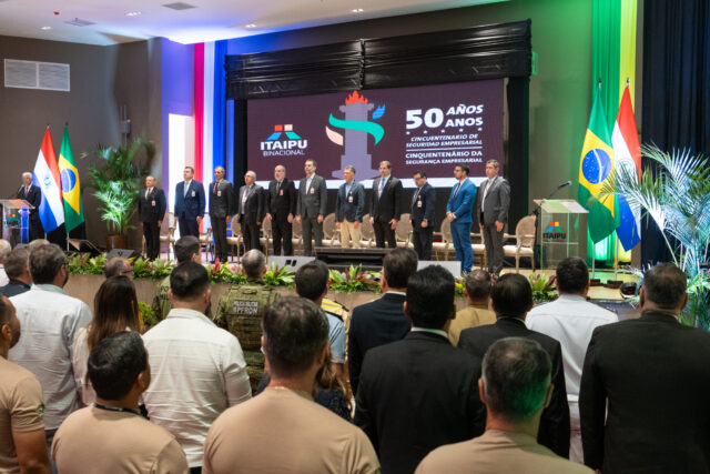 Cerca de 400 pessoas, entre empregados(as), diretores, aposentados(as), estagiários(as) e autoridades ligadas às forças de segurança do Brasil e do Paraguai participaram nesta quarta-feira (30), pela manhã, da celebração oficial dos 50 anos de criação da Segurança Empresarial de Itaipu, de ambas as margens, comemorado no dia 3 deste mês.