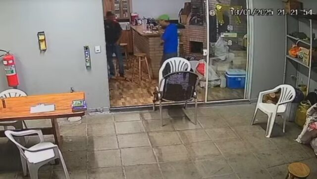 Uma câmera de segurança instalada no local registrou a cena na área gourmet da residência, localizada em um bairro de classe média em Cascavel. A dupla de criminosos fugiu com uma caminhonete do dono da casa e de barriga e bolsos cheios.