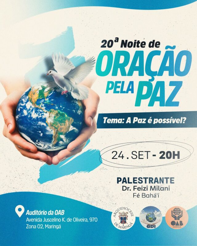 O Grupo de Diálogo Inter-religioso (GDI) de Maringá convida a comunidade para a 20ª Noite de Oração pela Paz, evento inter-religioso que celebra a união entre diferentes crenças em prol da paz e da não-violência. A atividade será realizada no dia 24 de setembro, às 20h, no Auditório da Ordem dos Advogados do Brasil (OAB) – Subseção de Maringá, localizada na Avenida Juscelino K. de Oliveira, 970, Zona 02.
