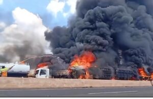 Houve vazamento de combustível, explosão, quatro veículos destruídos pelo fogo, duas mortes no local e uma vítima hospitalizada em estado grave.