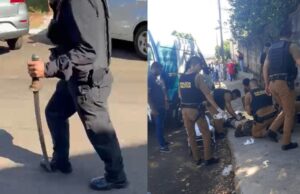 Um homem vestindo uniforme de segurança e com uma espada de samurai na mão atacou um agente penitenciário em frente ao Fórum de Andirá,...