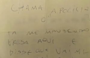 “Tá me mantendo presa aqui e disse que vai me matar. Por favor”, escreveu uma mulher em um pedaço de papel que conseguiu jogar...